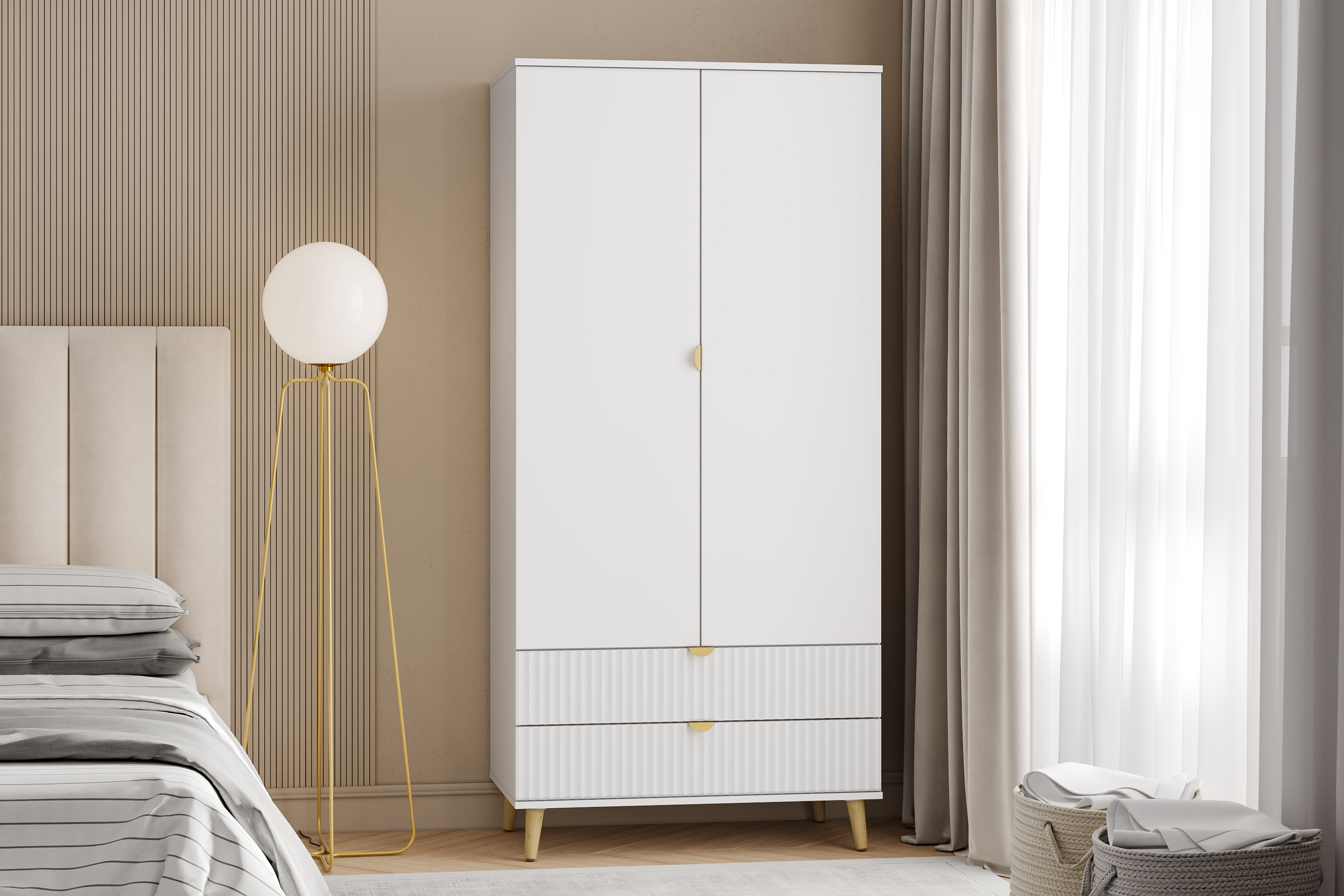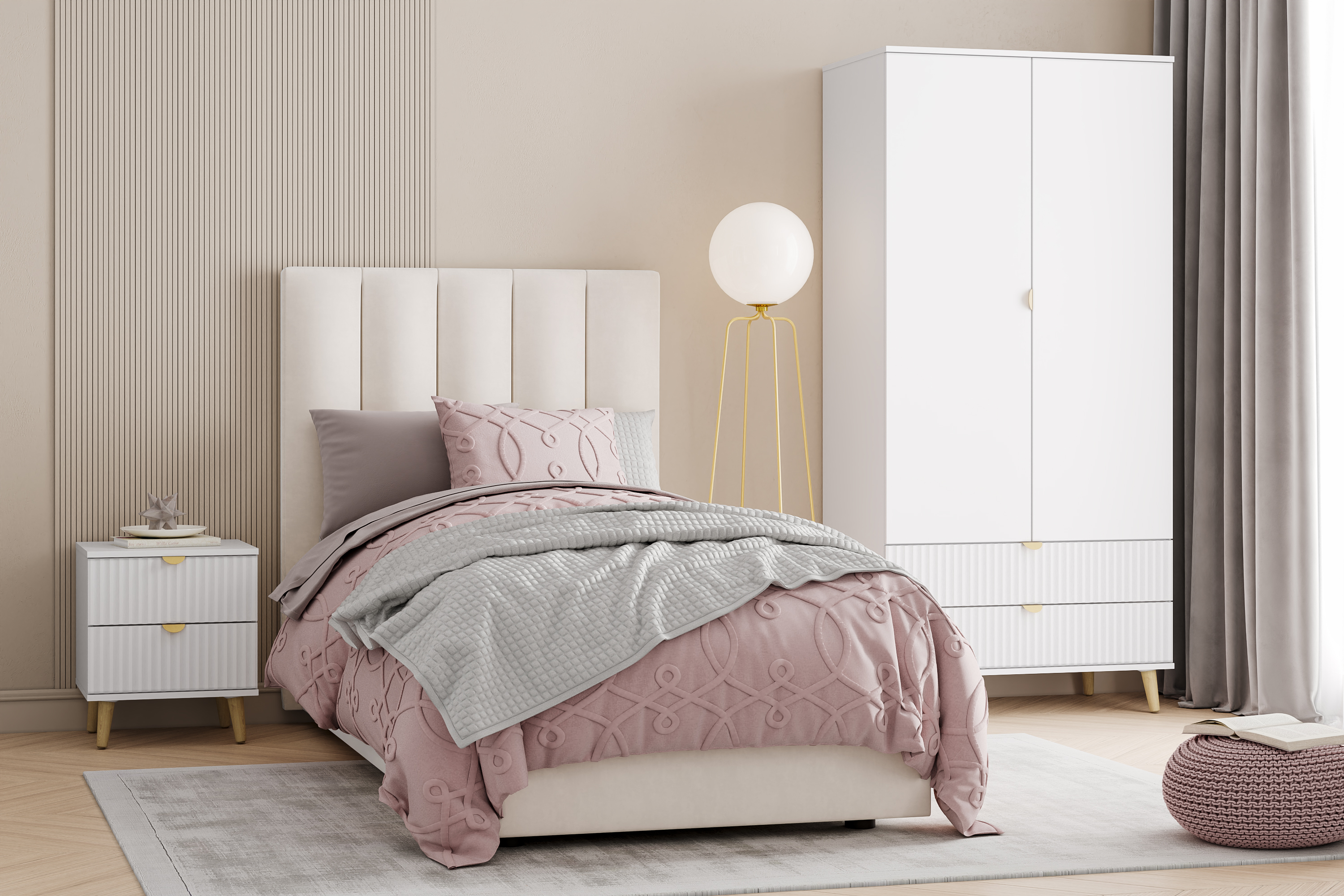 Модульная композиция включает прикроватную тумбу, оснащенную выдвижными ящиками, которые открываются плавно и бесшумно благодаря шариковым направляющим, а в шкафу удобно организовать предметы одежды, при этом высокие опоры облегчают процесс уборки.
