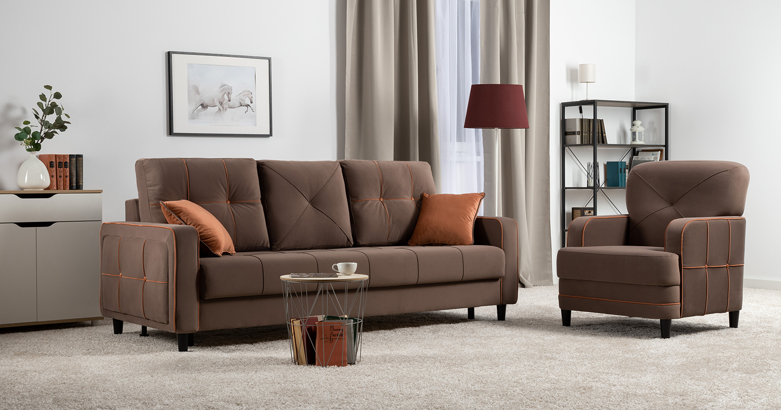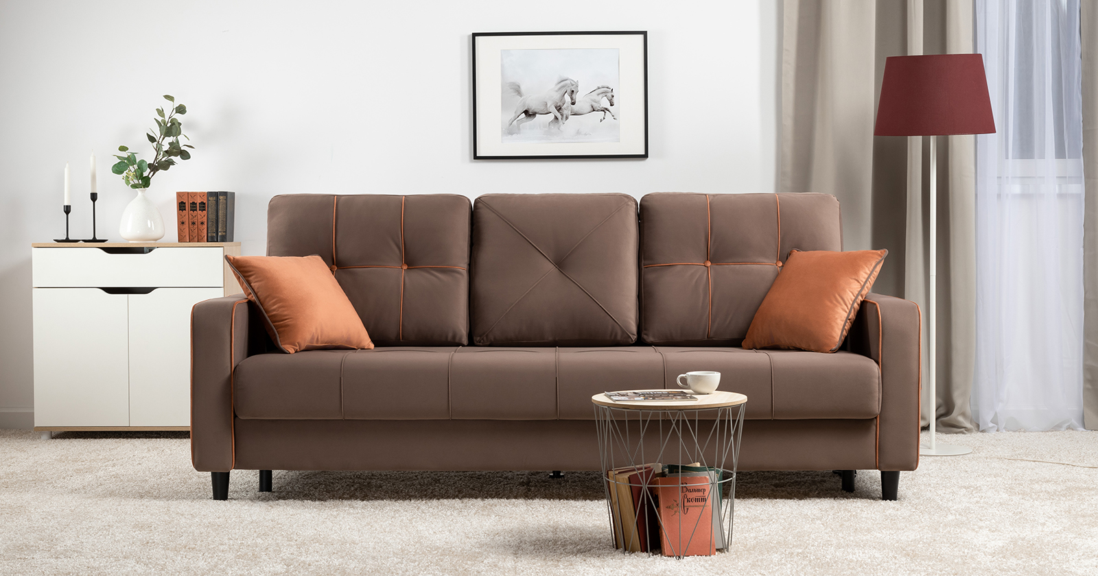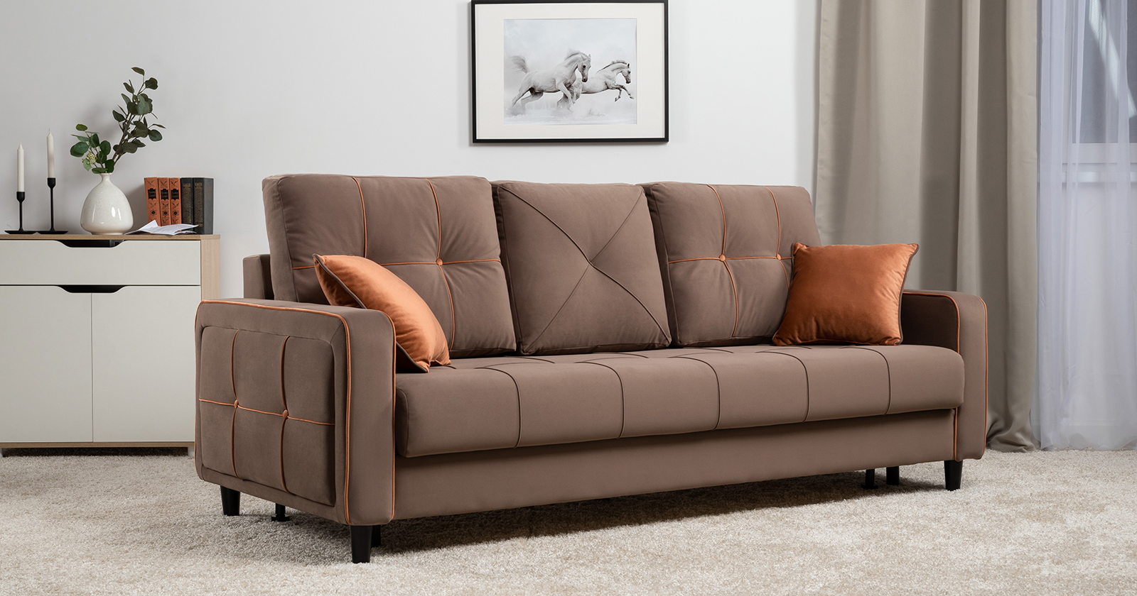 Модные диваны Черри Н порадуют поклонников современного стиля. Контрастные канты, пуговицы и декоративные подушки делают этот диван ярким акцентом интерьера.