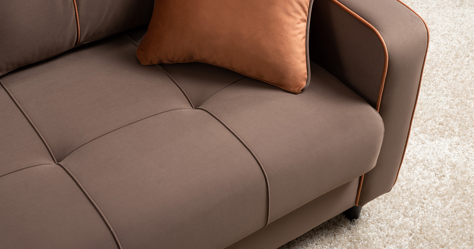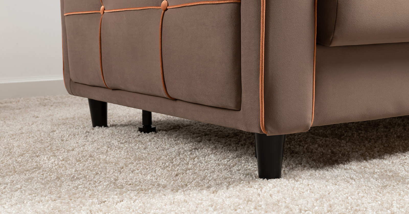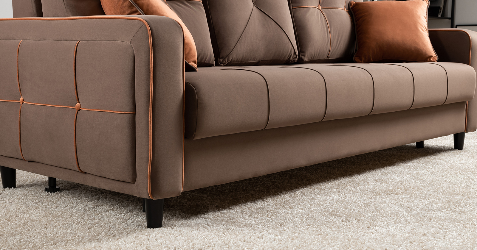 Декоративные канты на подушках и вставке подлокотников. Пуговицы в местах пересечения кантов на подушке и вставке подлокотников. По торцам подлокотников и думках контрастный декоративный кант. Защипы на сиденье и средней большой подушке.