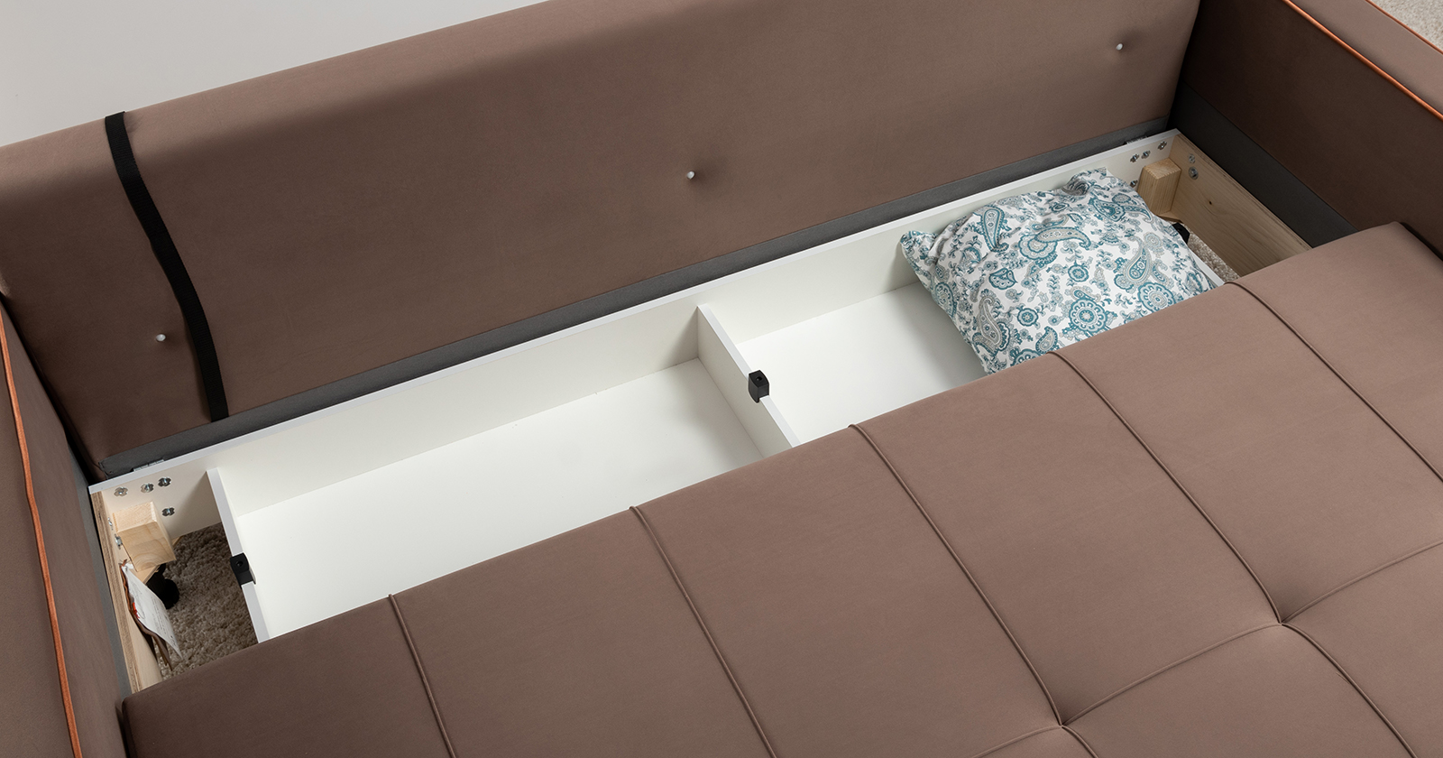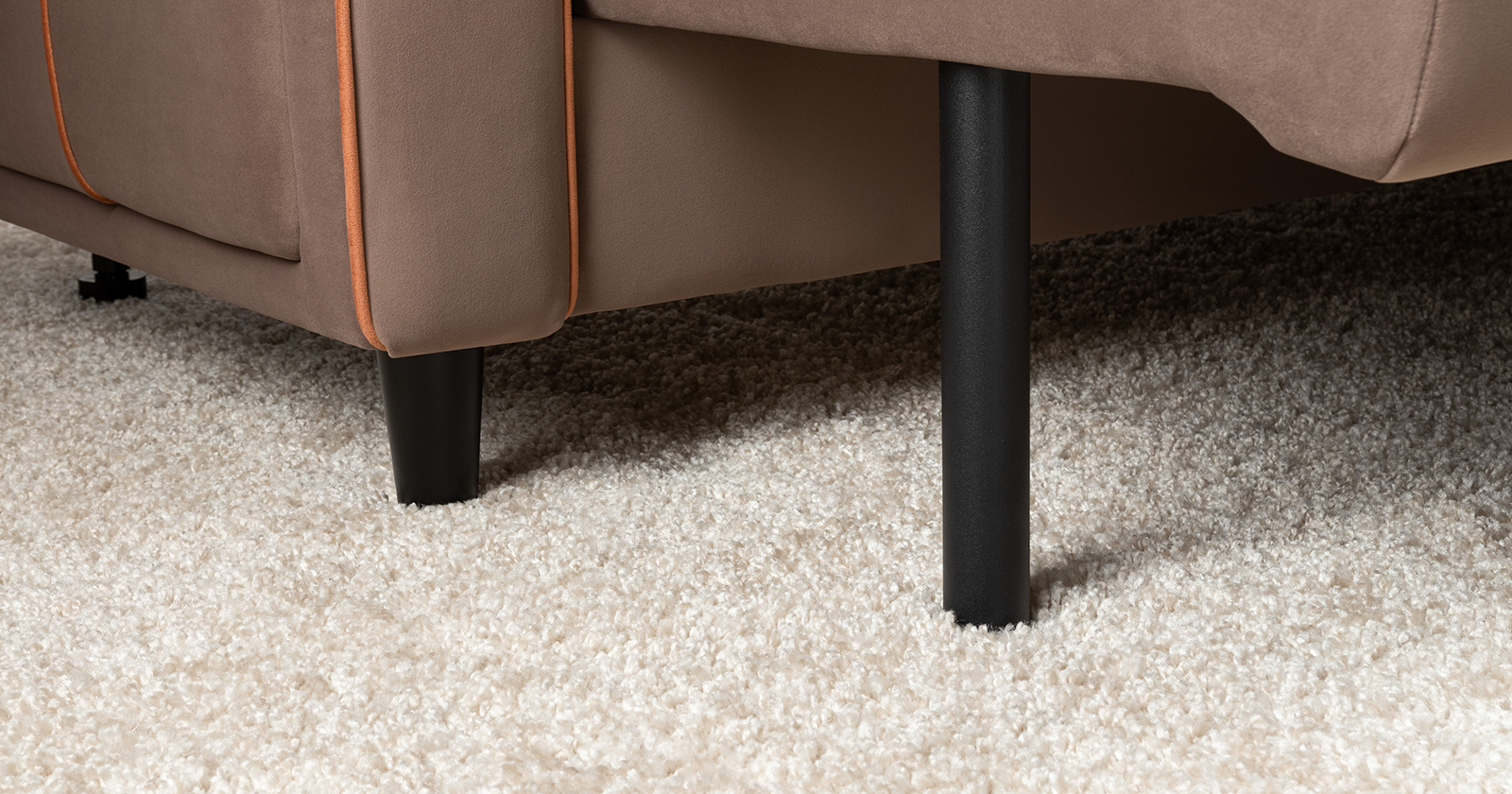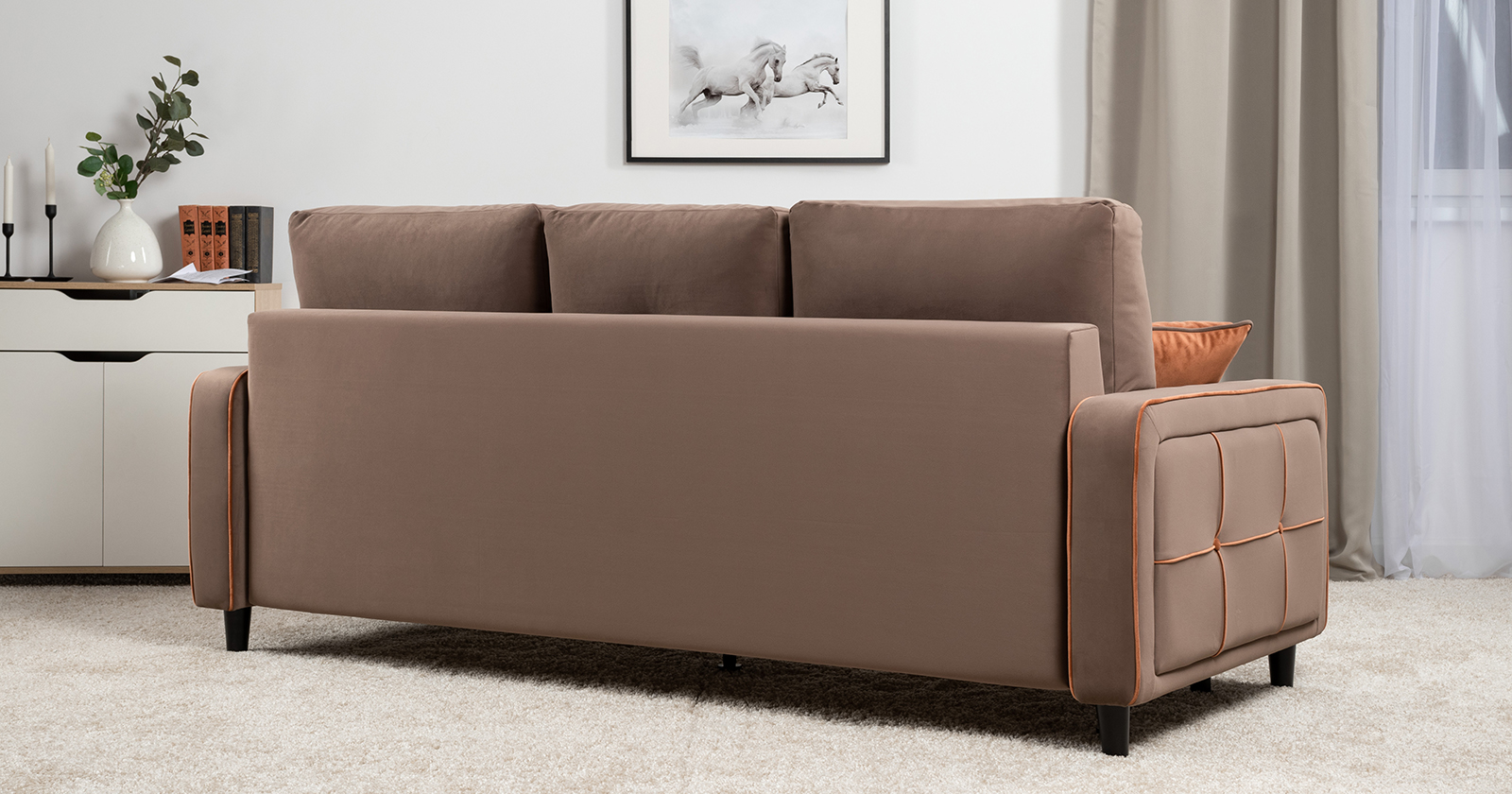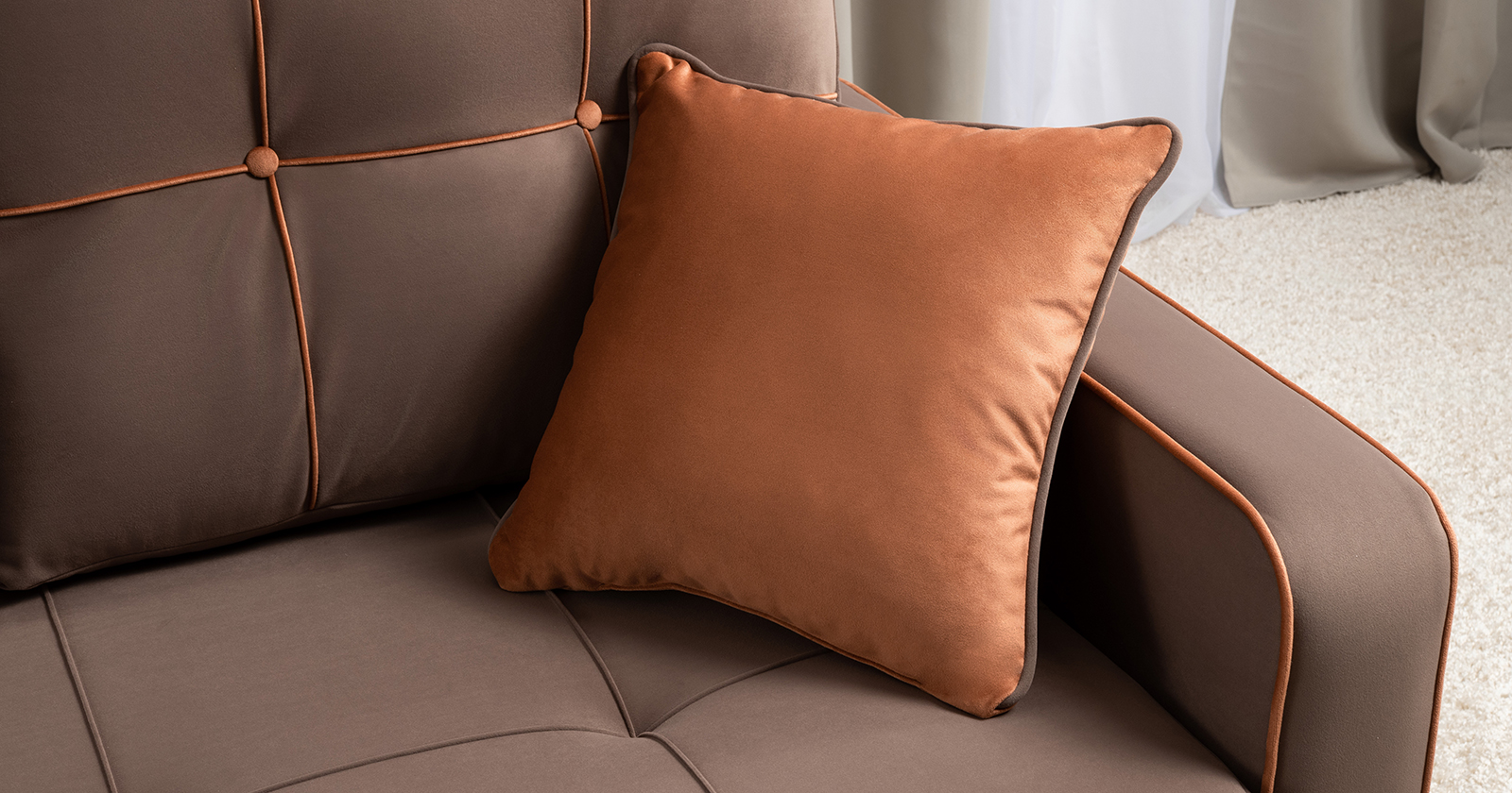 Декоративные канты на подушках и вставке подлокотников. Пуговицы в местах пересечения кантов на подушке и вставке подлокотников. По торцам подлокотников и думках контрастный декоративный кант. Защипы на сиденье и средней большой подушке.