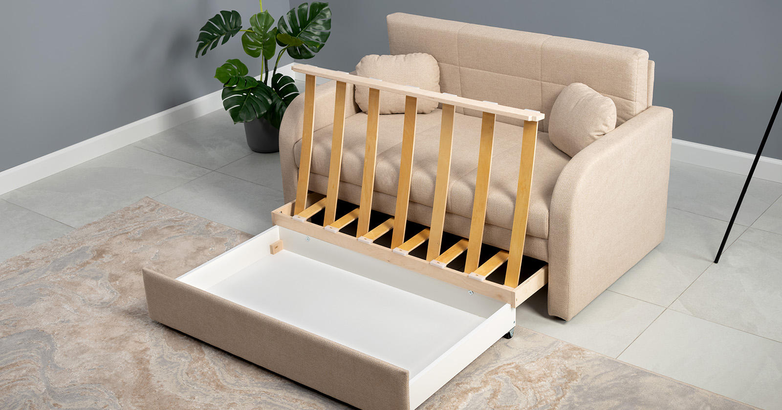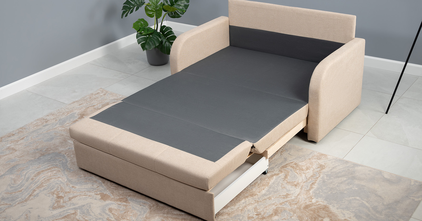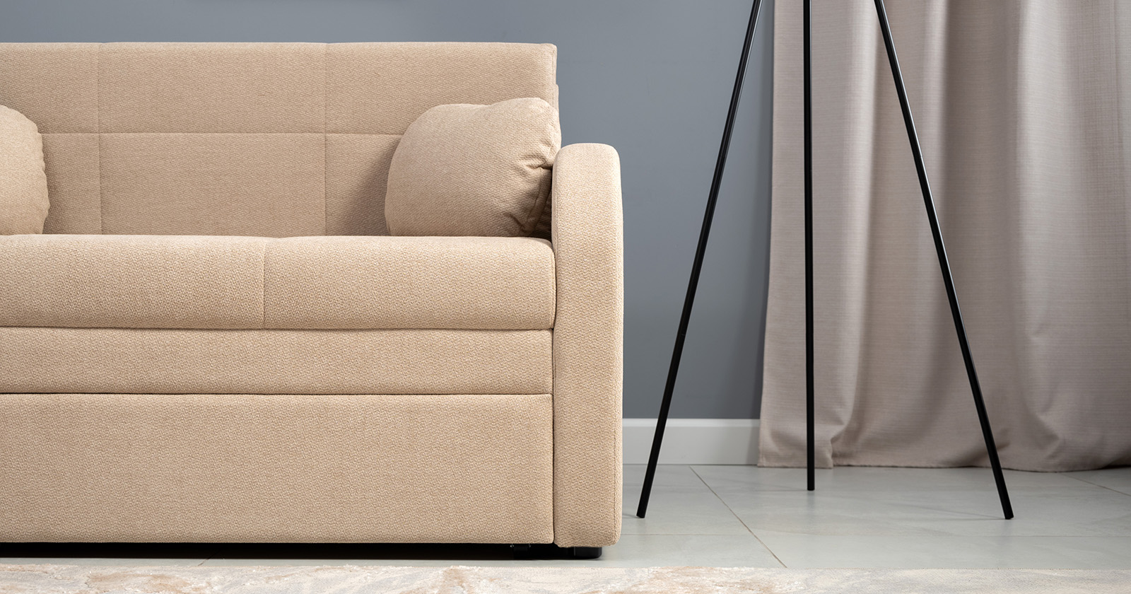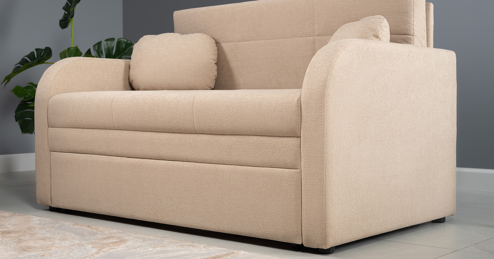 Коллекция выполнена в современном минималистичном стиле с мягкой обивкой из износостойкой ткани и декоративной стежкой, подчеркивающей геометрию форм. Механизм трансформации обеспечивает дополнительное спальное место, делая мебель не только эстетичной, но и максимально функциональной для небольших пространств.