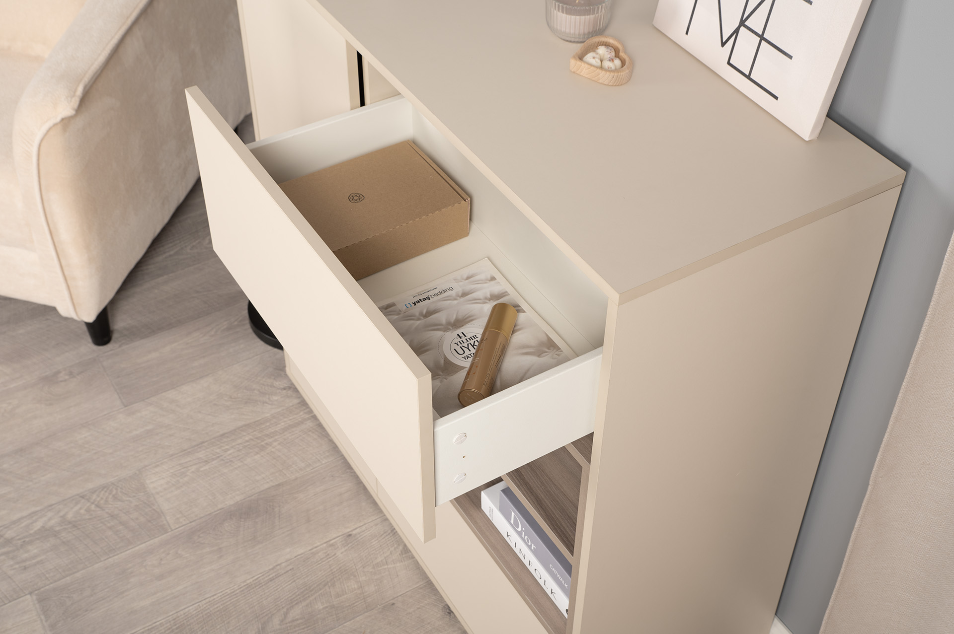 Комод Тайл 16.237 сатин 7045 SU, эмили блаш U9135, белый PE шагрень, собирается на любую сторону