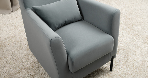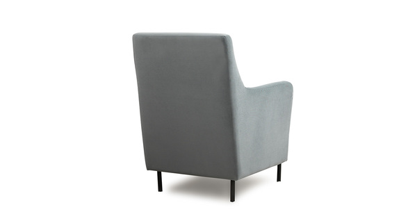 Декоративная утяжка на спинке кресла, декоративная подушка в цвете кресла, металлические опоры переходят в декоративный элемент подлокотника