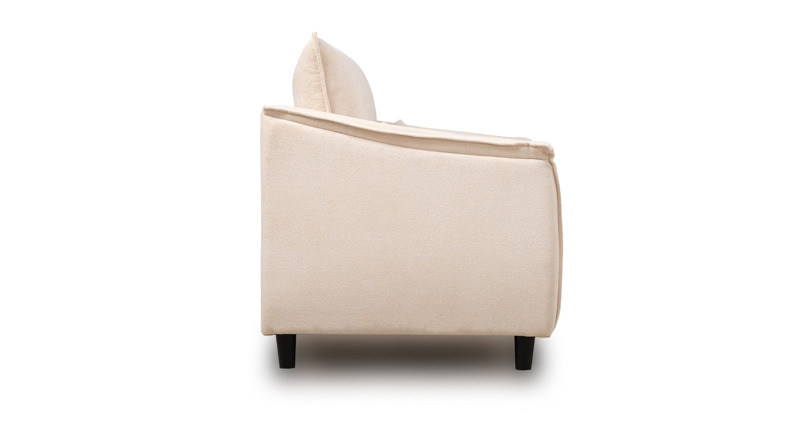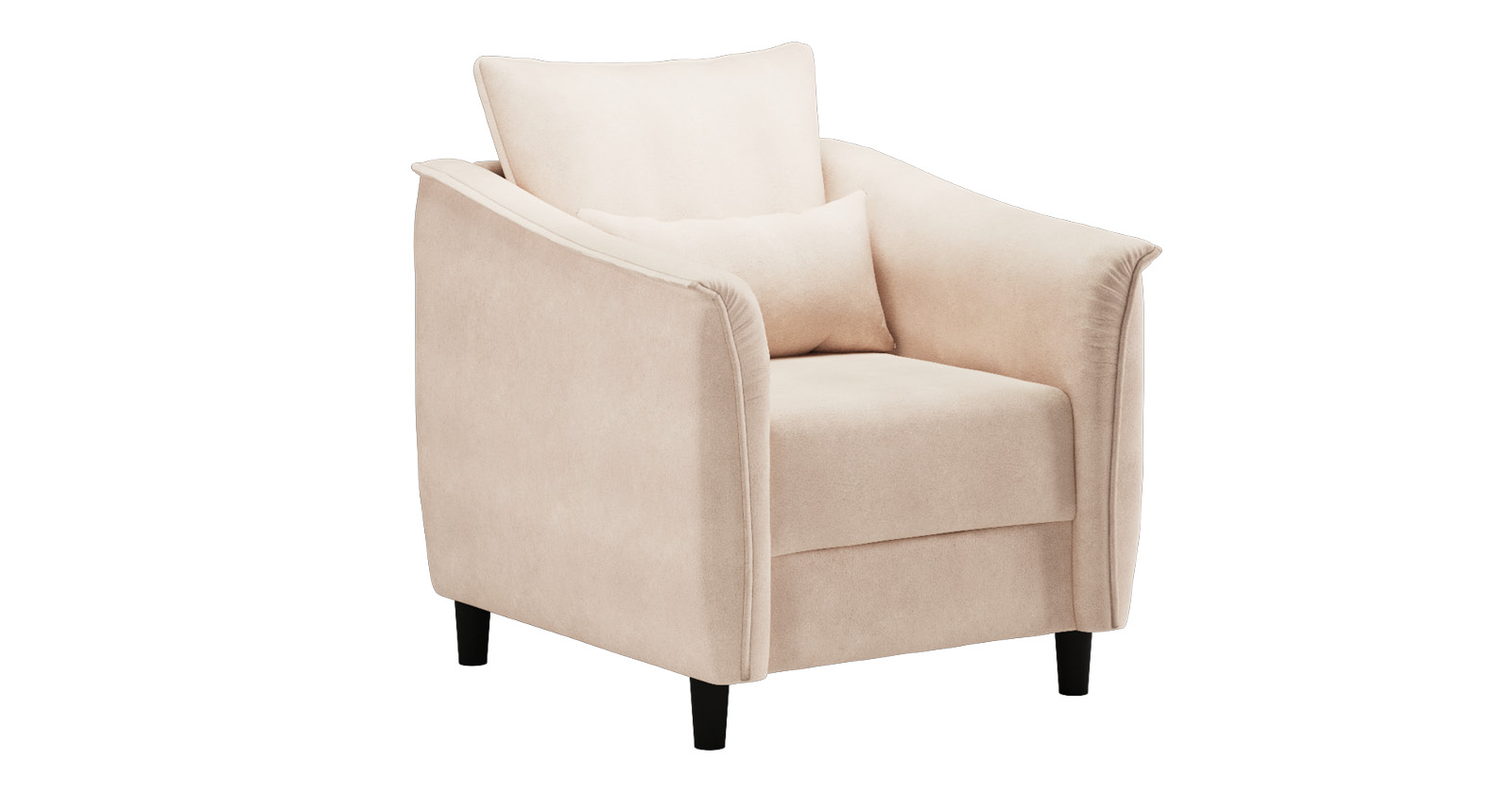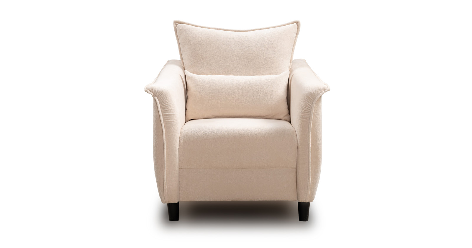 Кресло с приспинной подушкой трапецивидной формы на молнии, по трем сторонам которой проложена отделочная строчка на 1,2 см. По контуру боковин проложен декоративный кант на 1,2 см основной ткани. Кант проходит по центру передней части боковины, а по внутренней верхней части сборка.