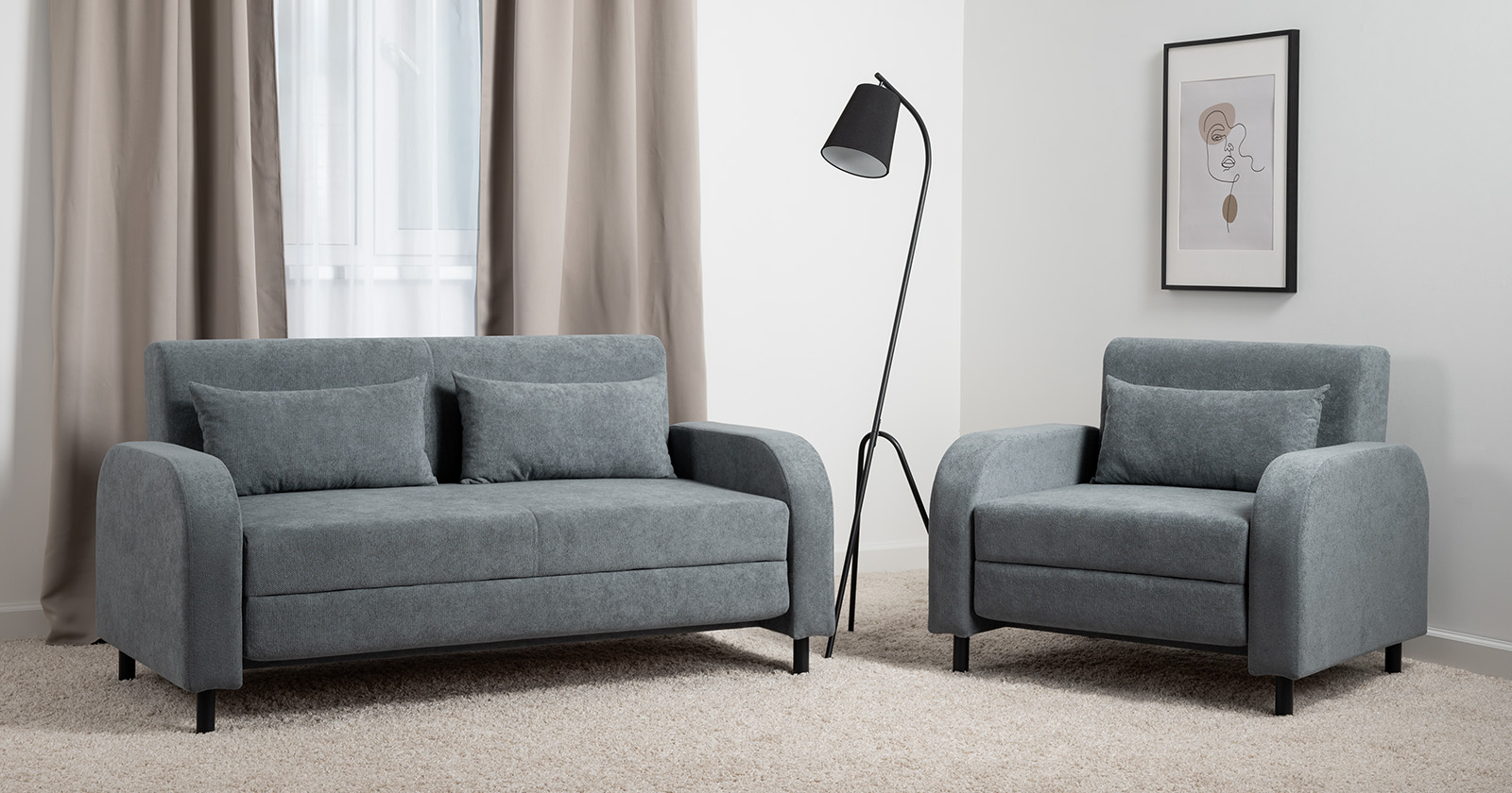 Диван и кресло сочетают в себе лаконичность и функциональность. Минималистичные линии и отсутствие лишних деталей делают коллекцию идеальной для интерьеров в современном стиле.