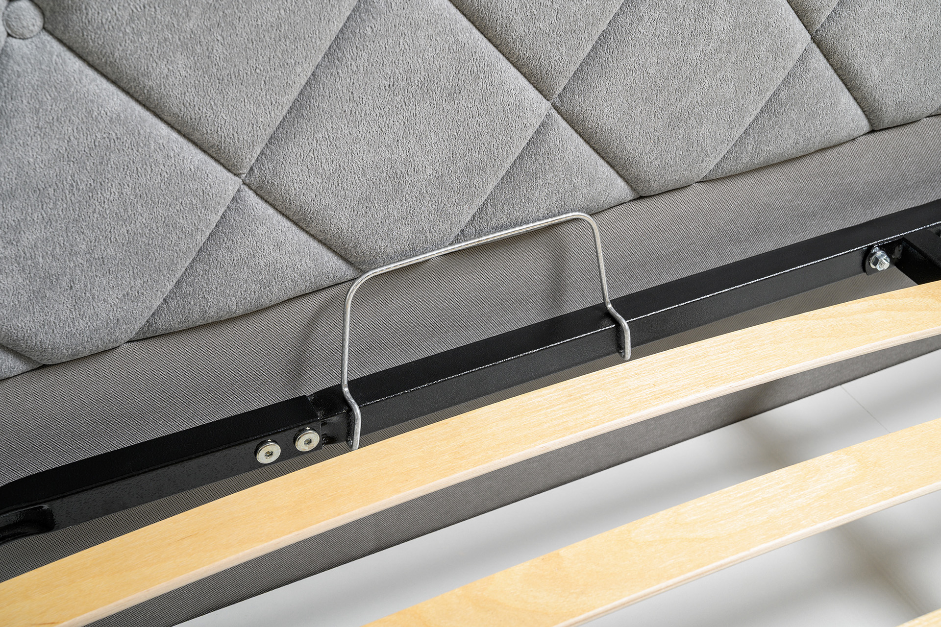 Основание кровати укомплектовано матрасодержателями. Жесткое кроватное дно из ЛДСП 16 мм на опорах 25 мм.