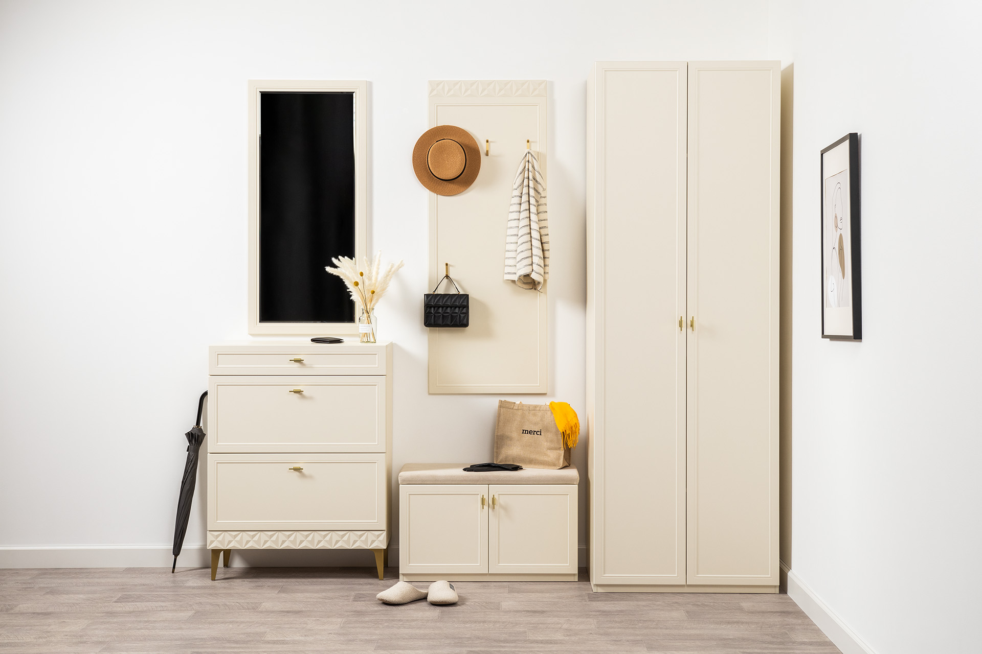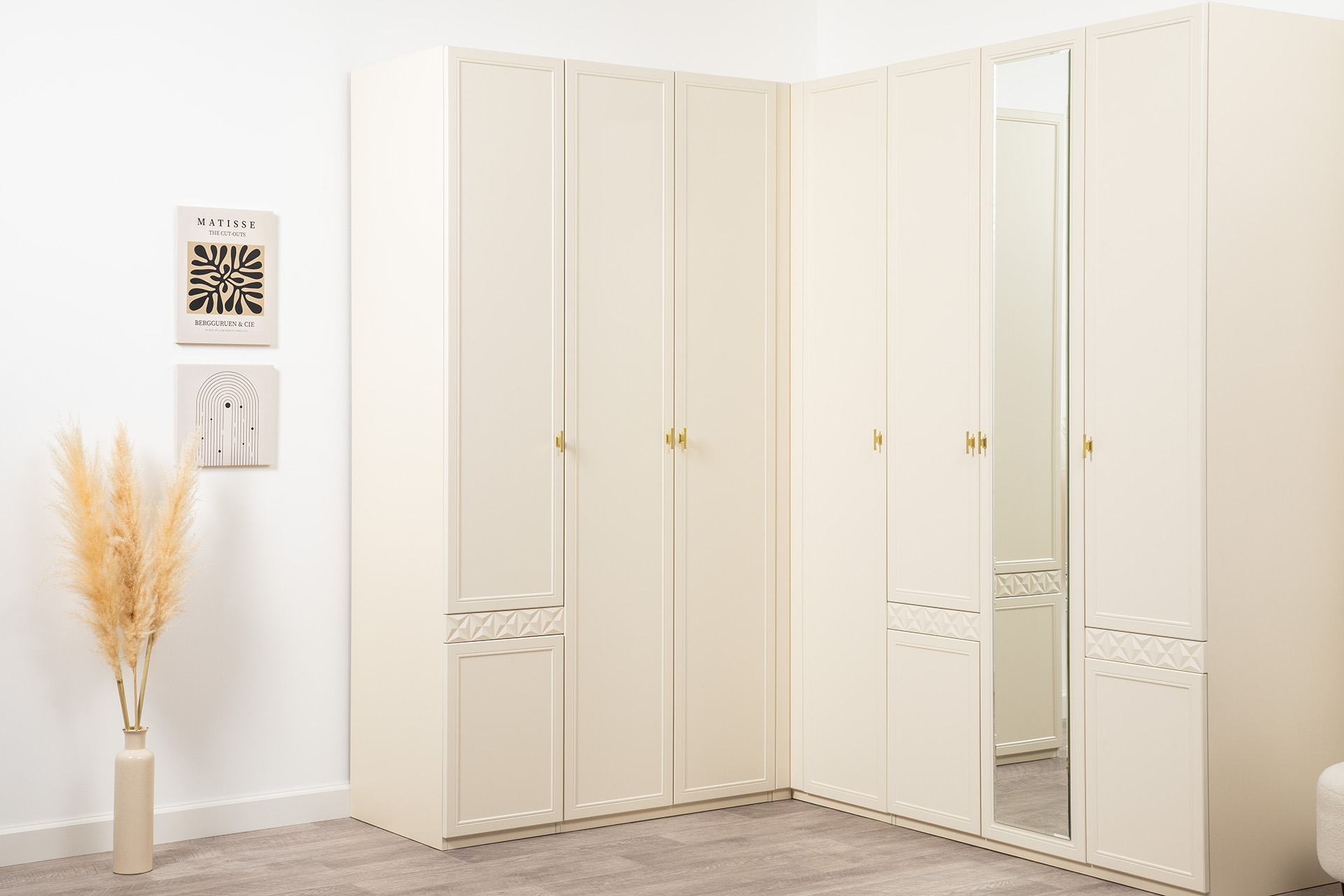Изящные линии, глубокая фрезеровка фасадов из МДФ и благородные оттенки. Утончённая «Слоновая кость» и изысканная «Олива Шагрень» с глубоким зелёным тоном — создают атмосферу уюта, тепла и благородства. Металлические ручки и опоры золотого цвета придают мебели утончённый блеск, а петли и направляющие с доводчиками обеспечивают плавное и бесшумное закрытие фасадов.