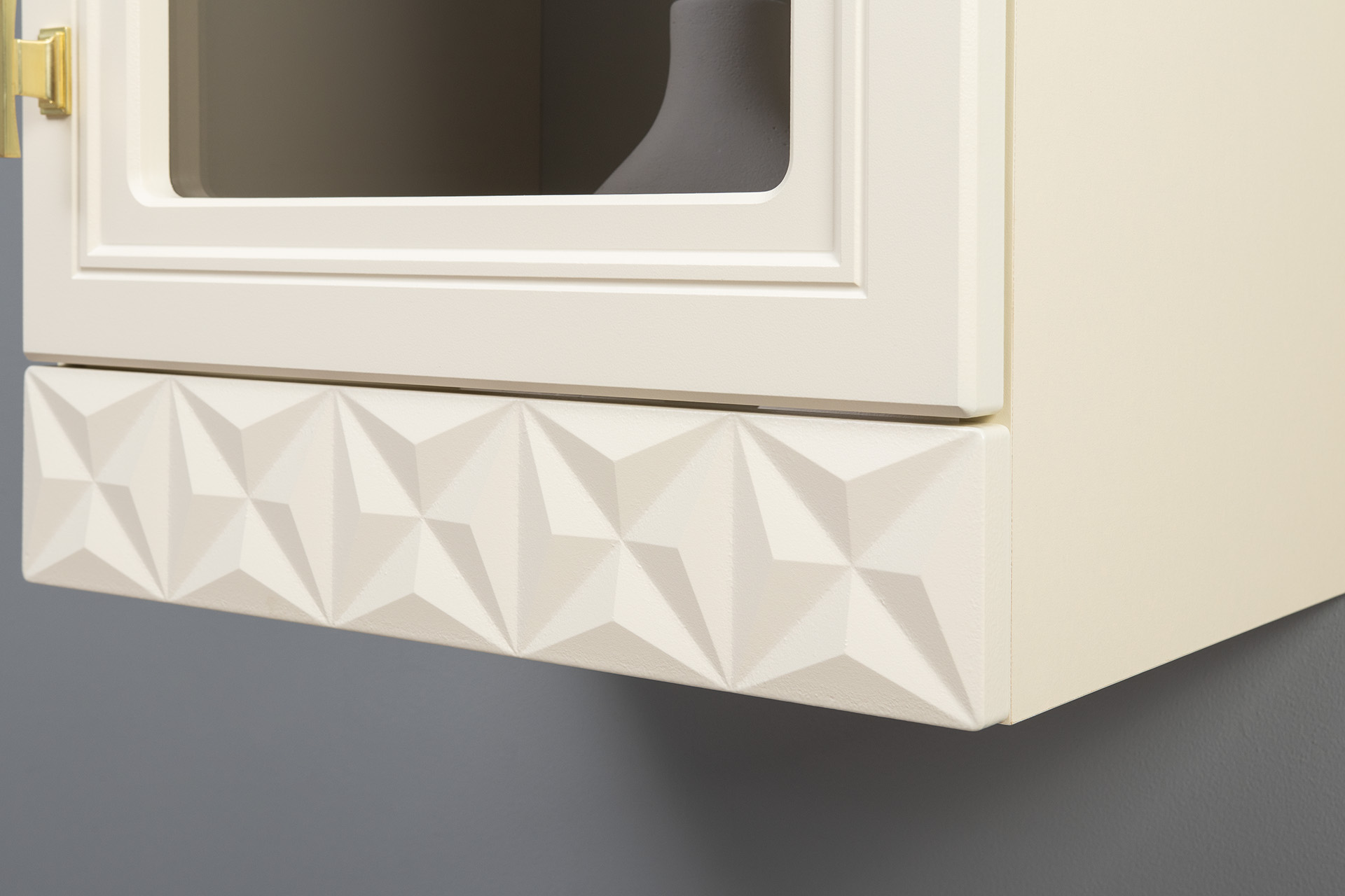 Изящные линии, глубокая фрезеровка фасадов из МДФ и благородные оттенки. Утончённая «Слоновая кость» и изысканная «Олива Шагрень» с глубоким зелёным тоном — создают атмосферу уюта, тепла и благородства. Металлические ручки и опоры золотого цвета придают мебели утончённый блеск, а петли и направляющие с доводчиками обеспечивают плавное и бесшумное закрытие фасадов.