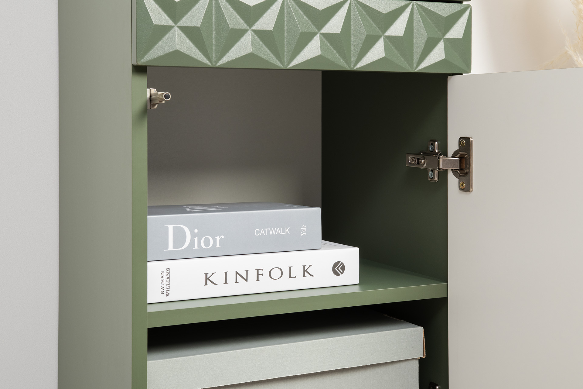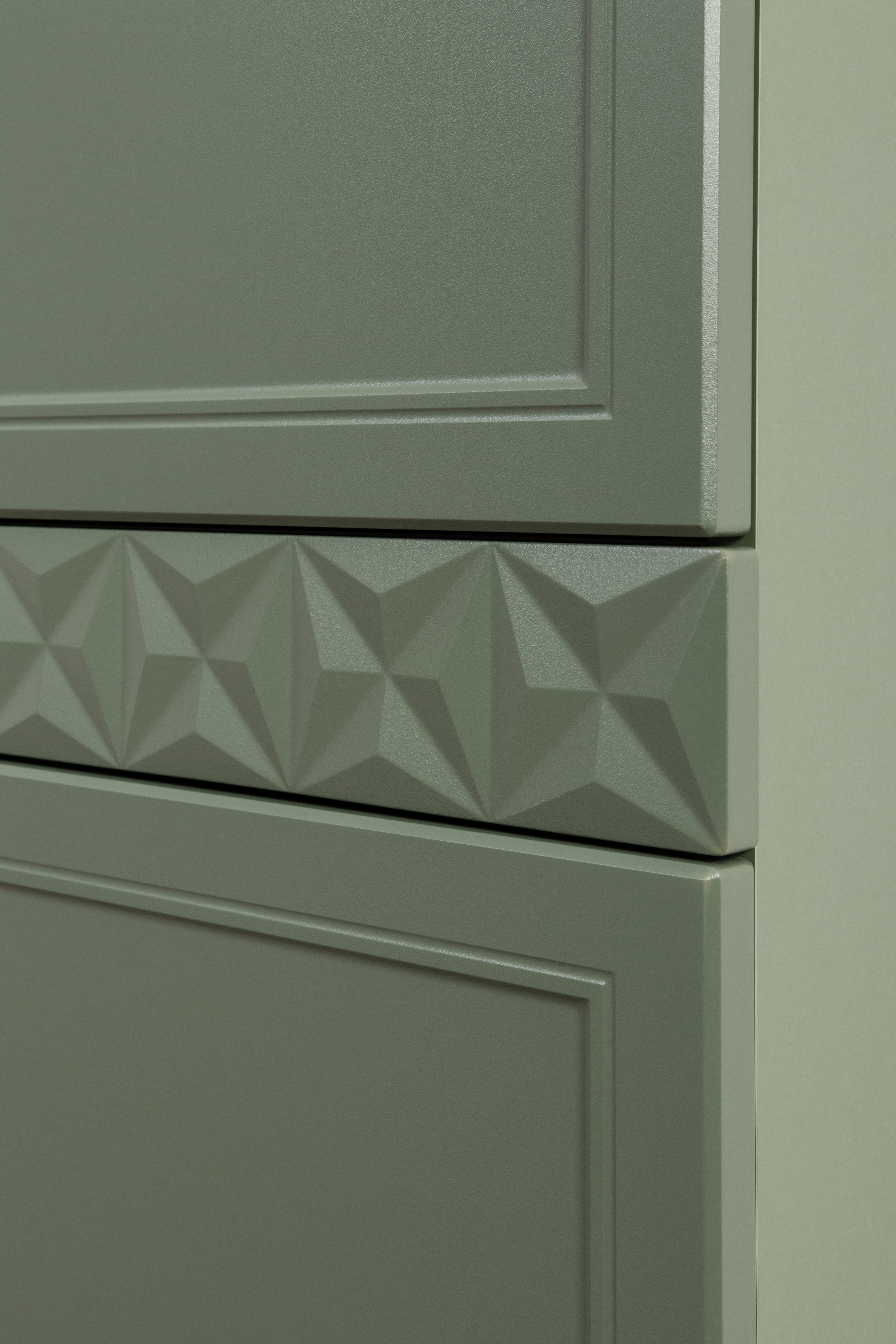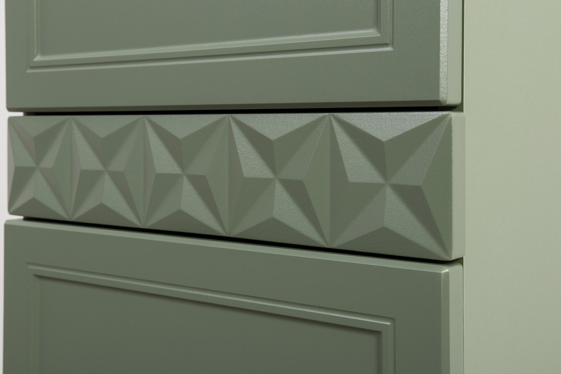 Комод Марион 16.249 дымчатый зеленый K521, олива шагрень AG 1050 ПВХ, белый PE шагрень