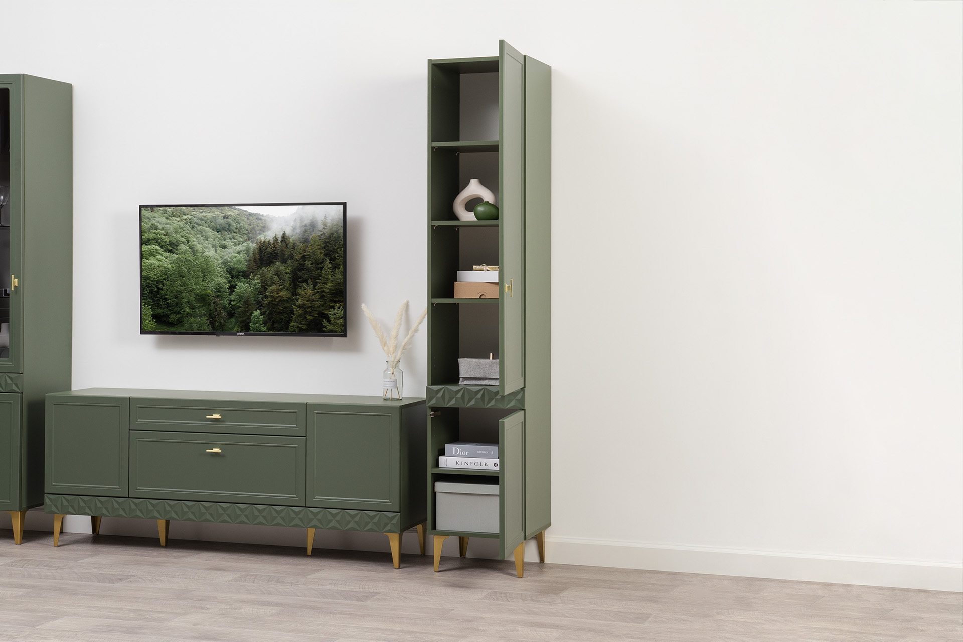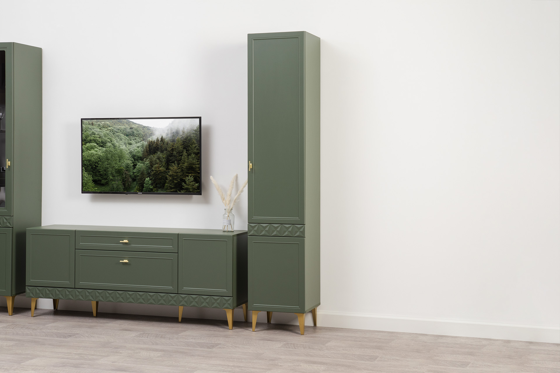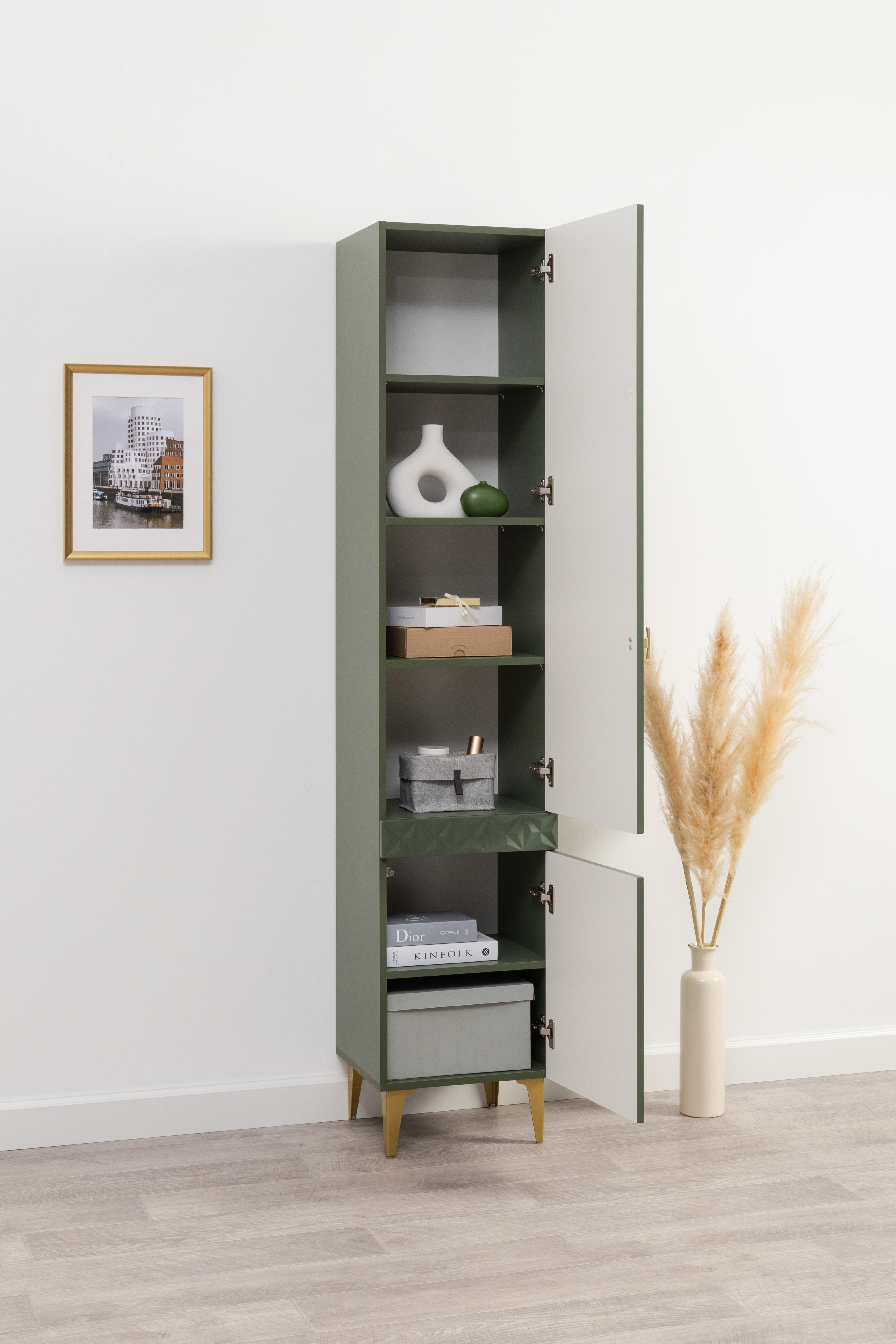 Шкаф-пенал Марион 16.333.01 дымчатый зеленый K521, олива шагрень AG 1050 ПВХ (собирается на любую сторону)