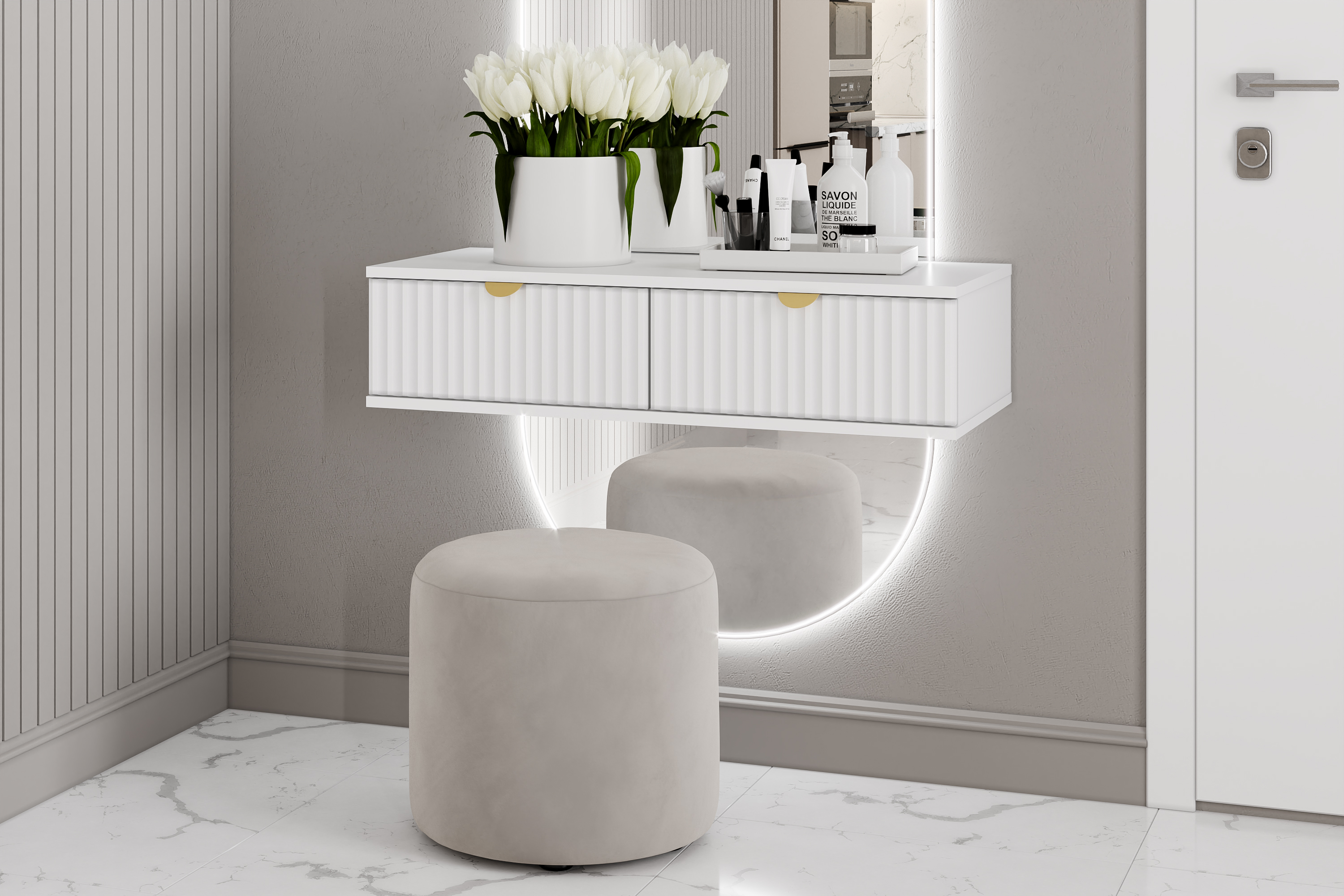 Модульная композиция включает 2 тумбы, оснащенные выдвижными ящиками, которые открываются плавно и бесшумно благодаря шариковым направляющим, комод и шкаф, в котором удобно организовать предметы одежды, при этом высокие опоры облегчают процесс уборки.