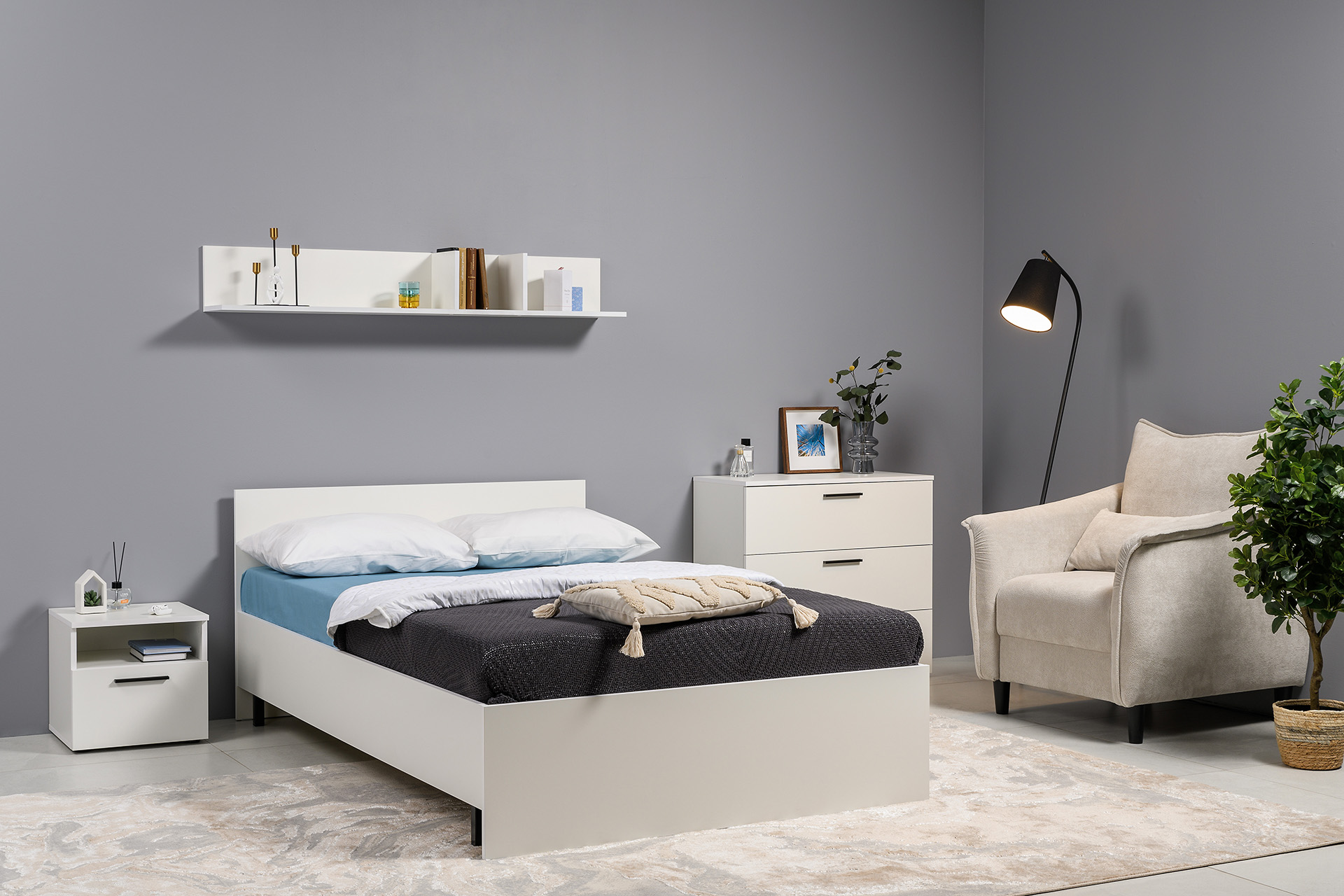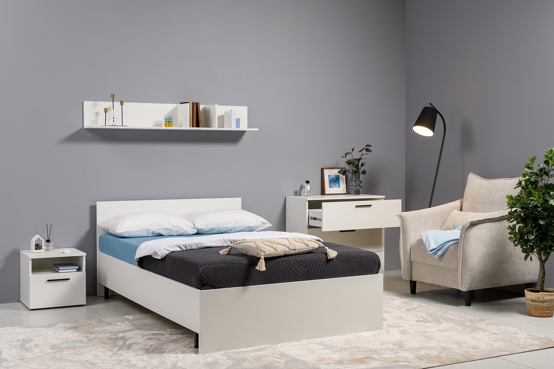 Два варианта кровати: ширина спального места 1200 и 1600 мм. Вместительный трёхстворчатый шкаф полноценной глубины с выдвижными ящиками и съемными полками. Ящики оснащены направляющими полного выдвижения.