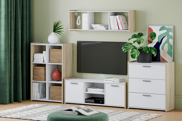 Тумба ТВА Симпл, выполненая в Скандинавском стиле и имеет минимальные габариты делая тумбу функциональной и стильной.  Характерная особенность тумбы «Симпл» - комбинация полок и ящиков. На полках можно размещать предметы декора, книги.Вместительная ниша, за распашными дверями, будет удобна для хранения необходимых мелочей.